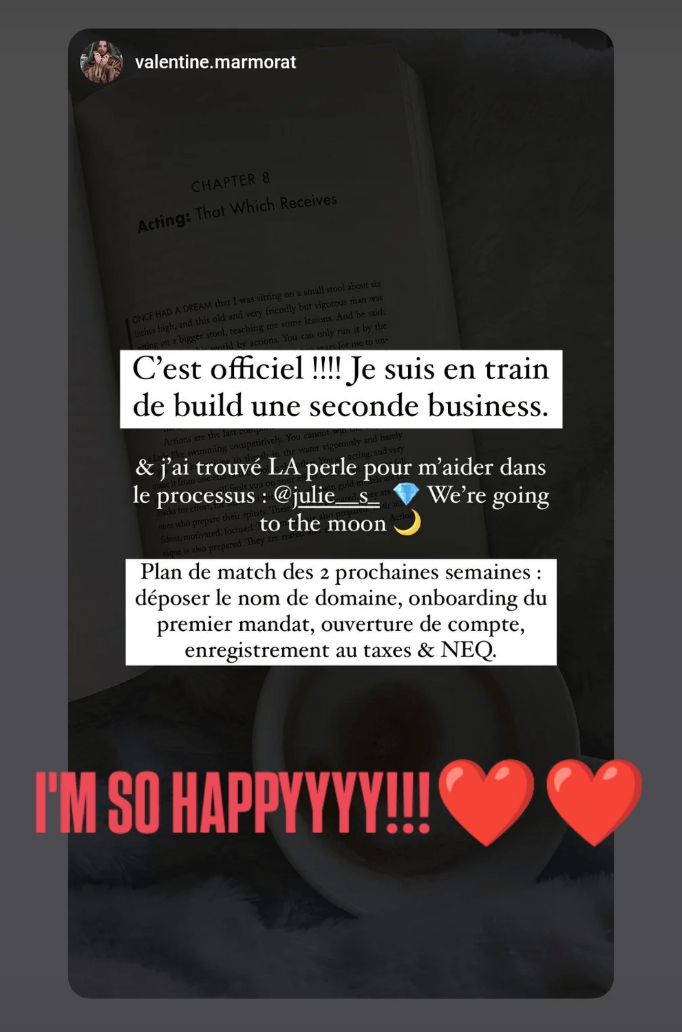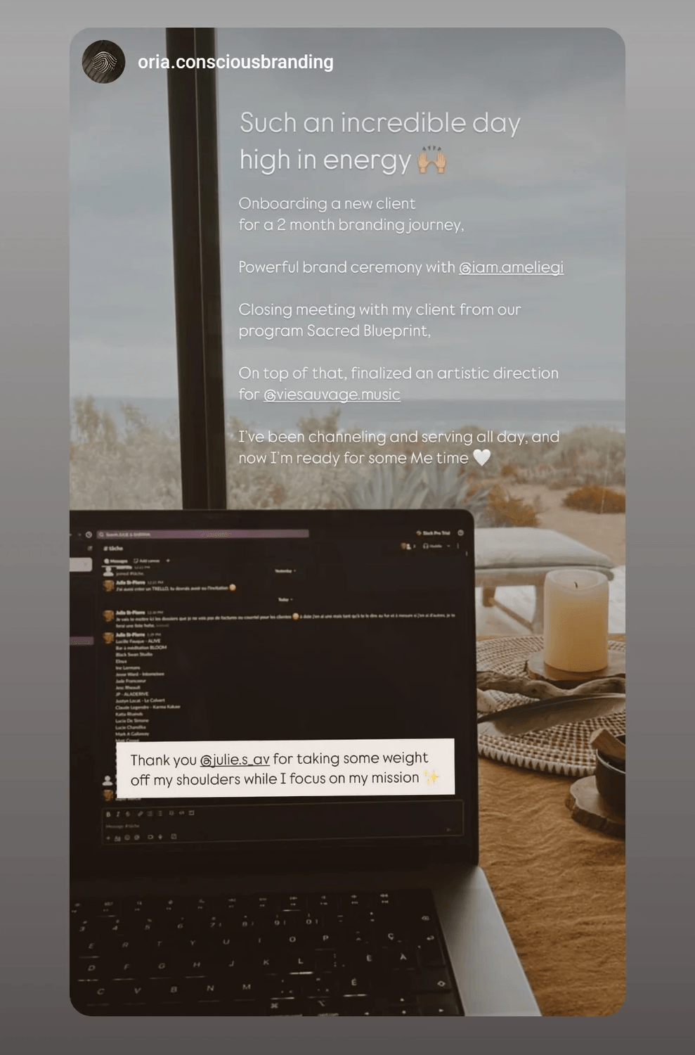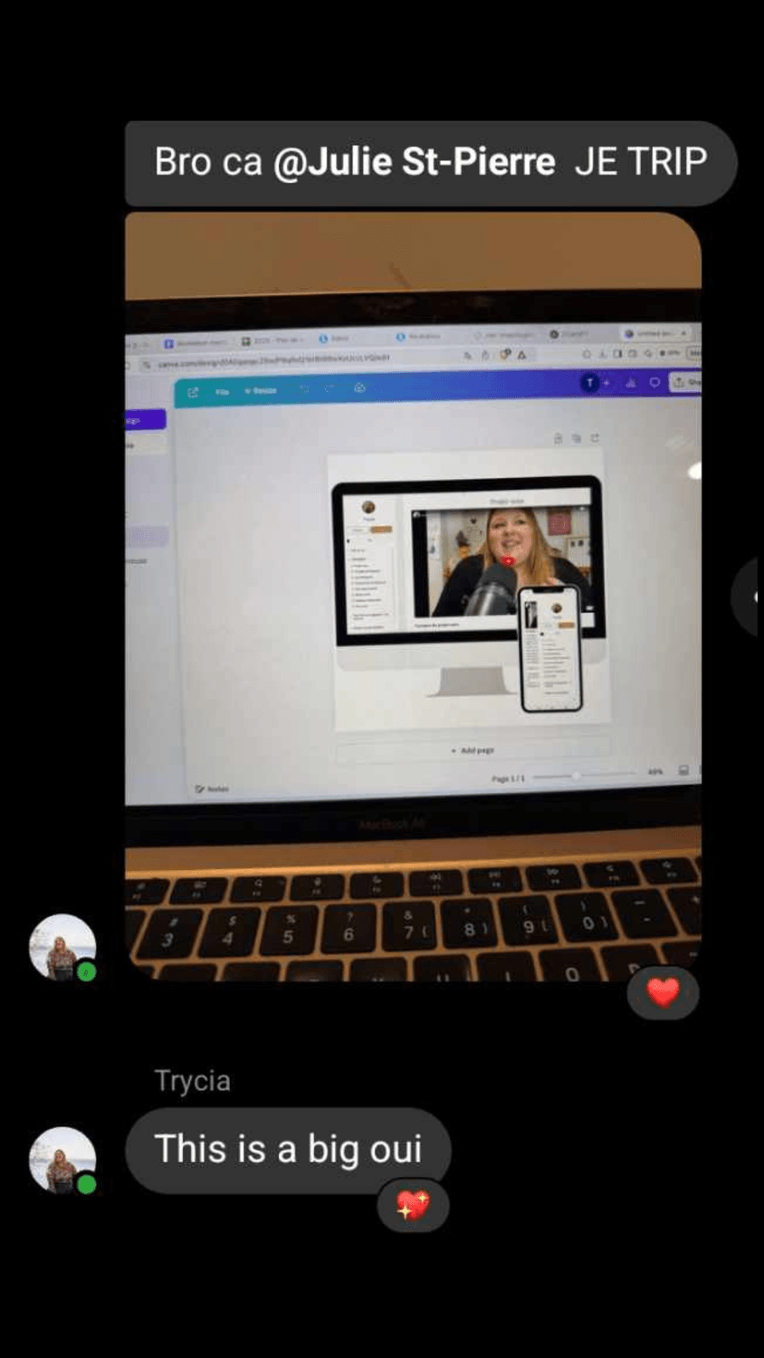 Je t’offre un accompagnement qui simplifie ta vie, qui t’enlève du poids des épaules, pis qui te permet de revenir à ce que t’aimes faire — ce qui te fait vibrer, ce qui te rapporte, ce qui te nourrit.